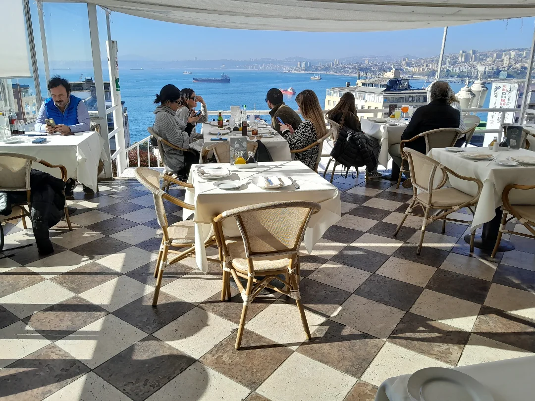 "Cocina chilena e internacional con vista panorámica a la bahía de Valparaíso."